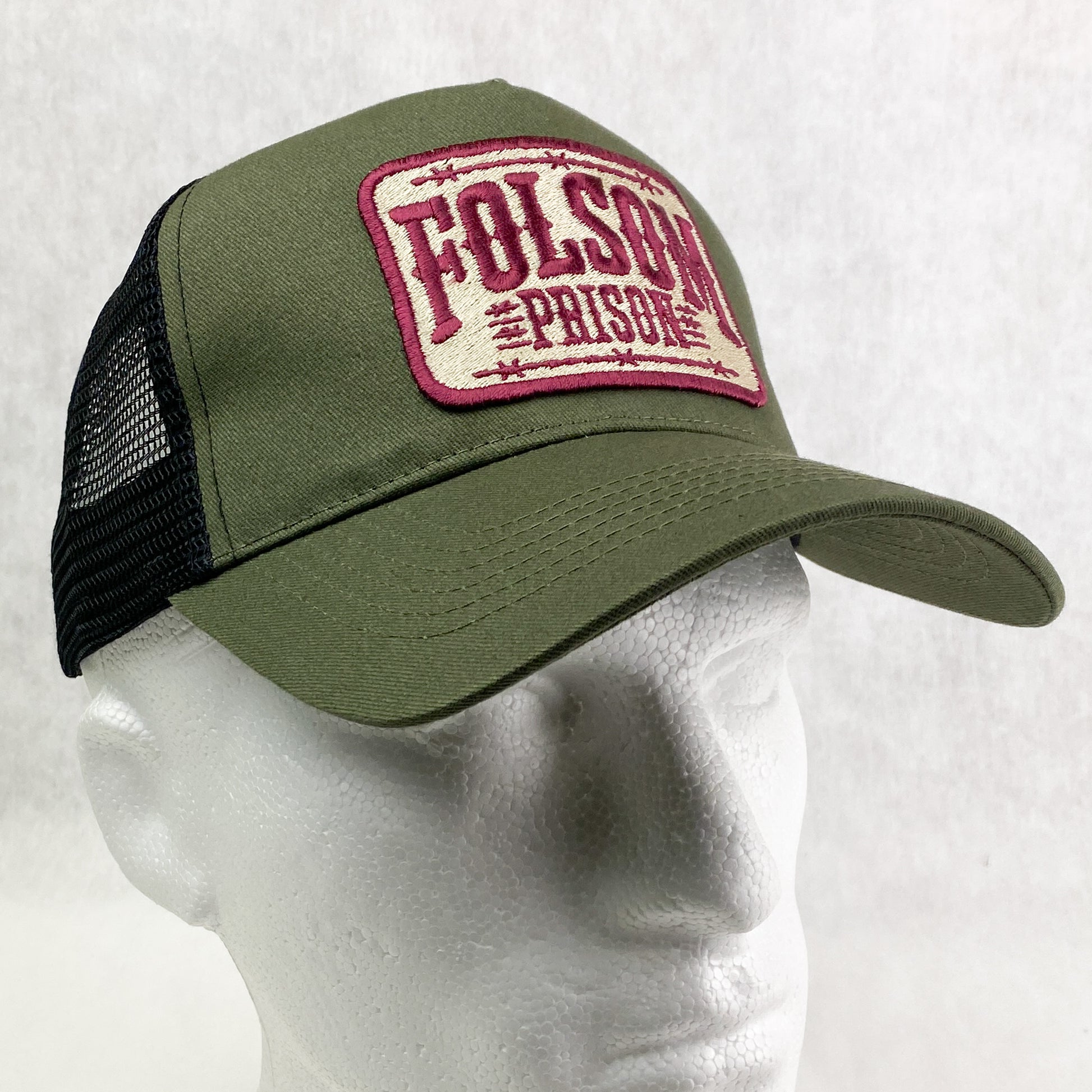 This olive green and black trucker cap features a vintage-style Folsom Prison embroidered patch — a tribute to Johnny Cash’s legendary live album and outlaw legacy. With a breathable mesh back and adjustable snapback, it’s built for all-day comfort, whether you’re out on the road or just kicking back with a classic record.