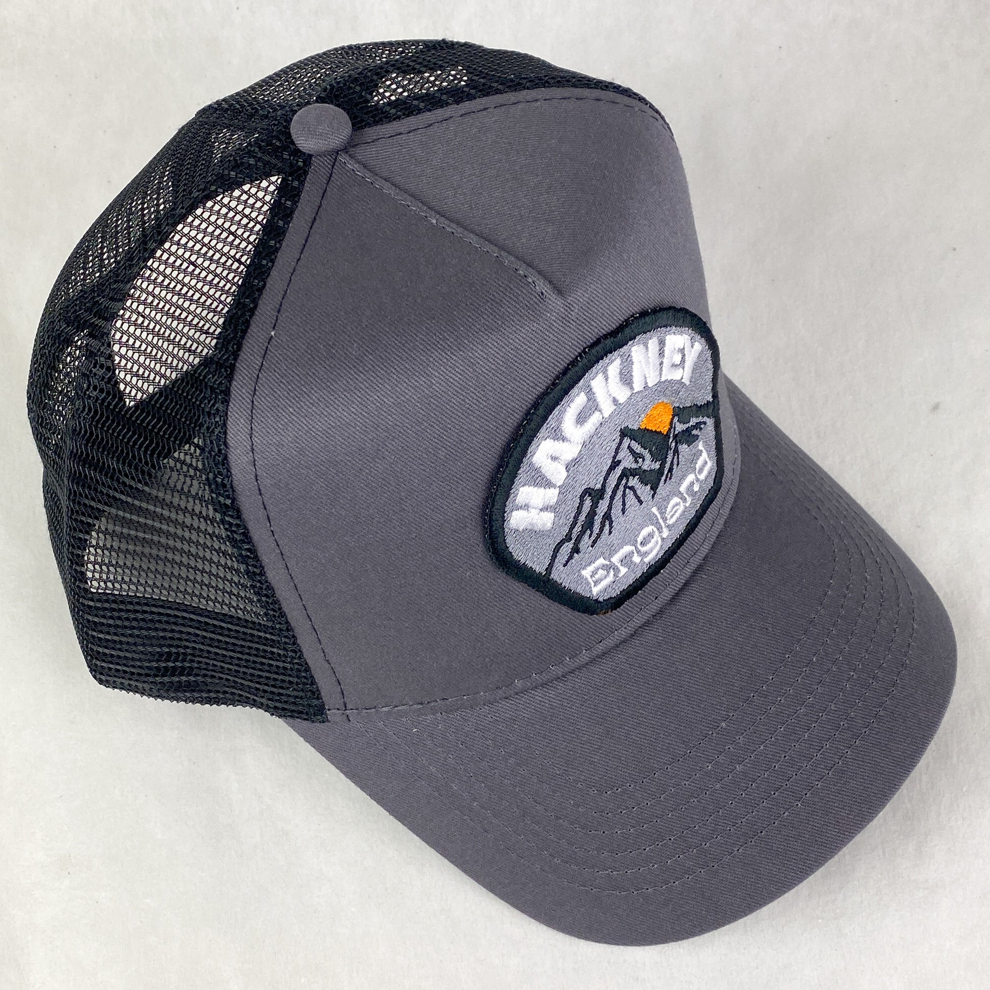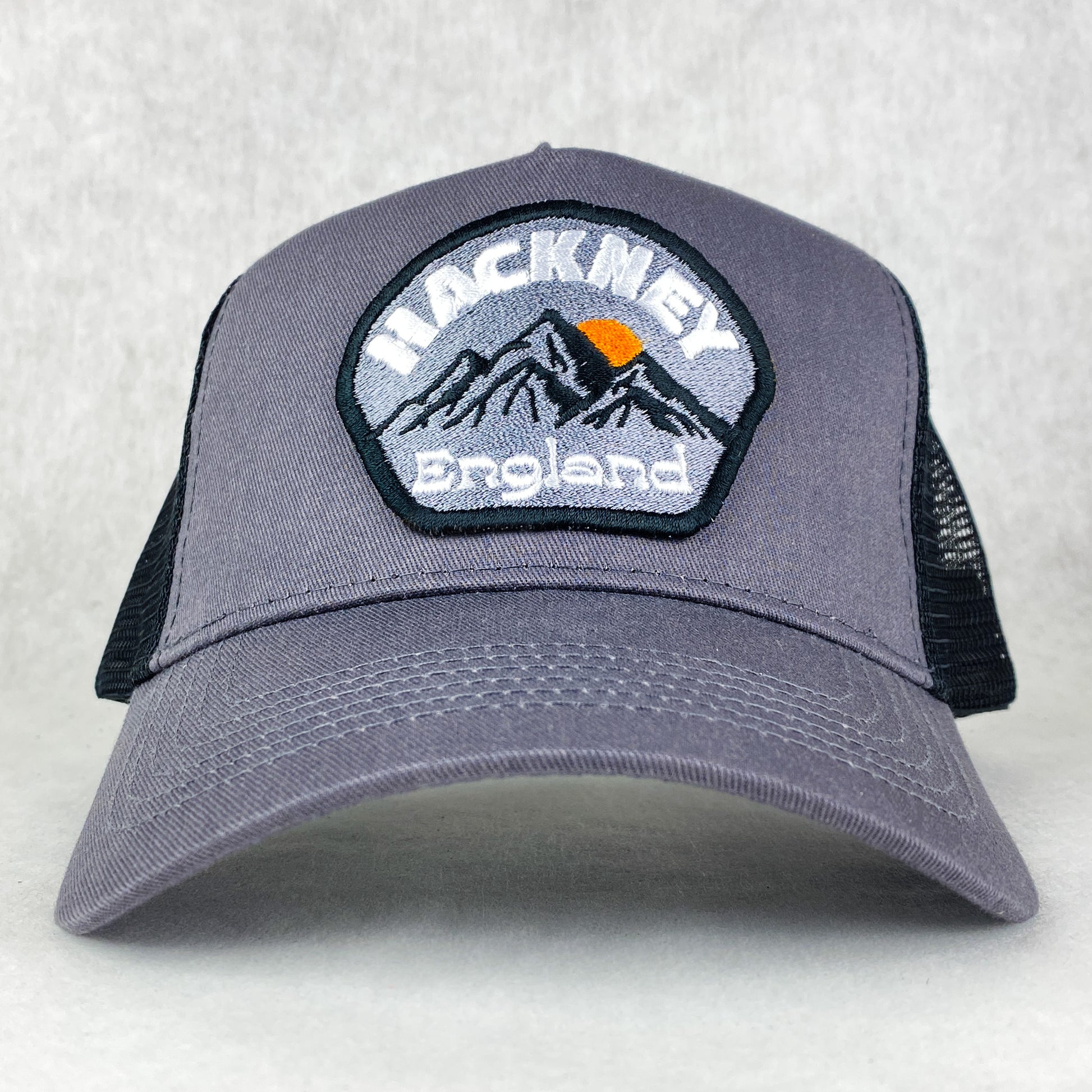 This grey and black vintage-style trucker cap features an exclusive embroidered patch reading Hackney, England, with a mountain and rising sun design that’s more about vibes than geography. It’s a tongue-in-cheek tribute to East London’s most iconic borough — for locals, ex-locals, and those who just love a good patch and a bit of contrast.